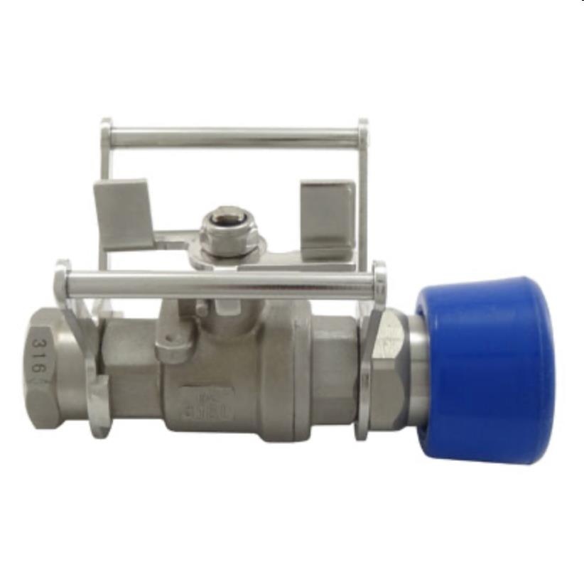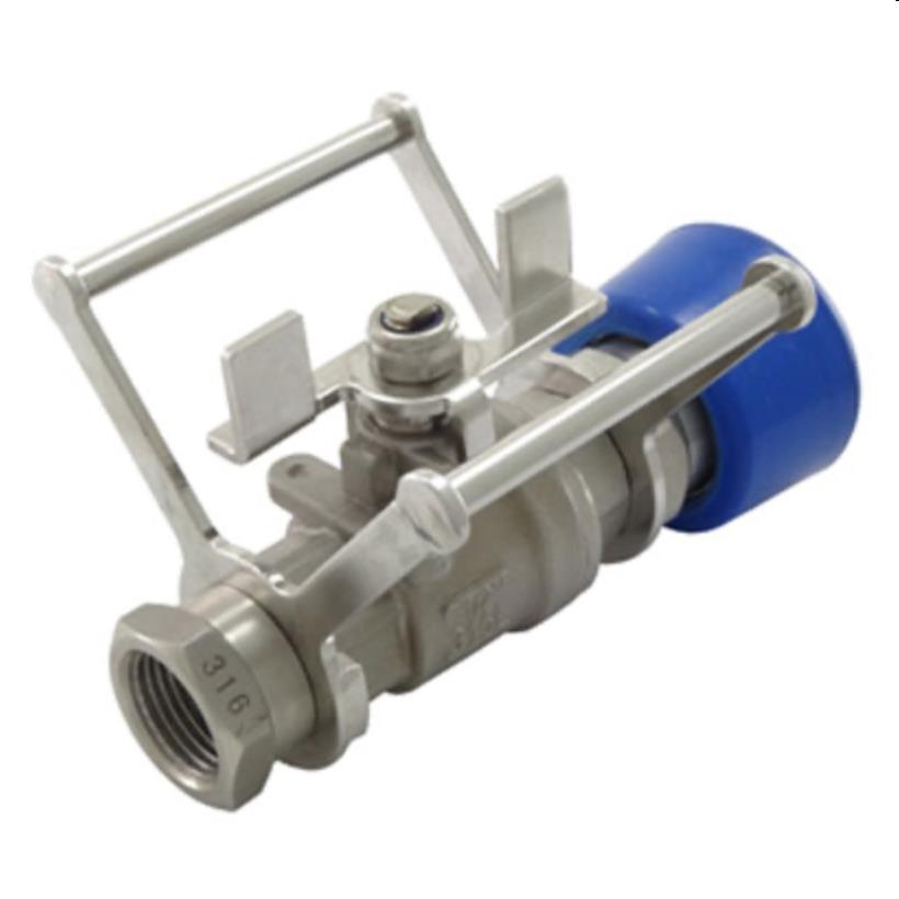 Deze multifunctionele RVS (AISI 316) kogelkraan heeft stevige metalen beugels die de bedieningshendel beschermen tegen beschadiging en tegen onbedoelde bediening.