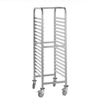 Extra zware roestvrijstalen uitvoering, voorzien van 4 zwenkwielen waarvan 2 geremd, 17 regalen